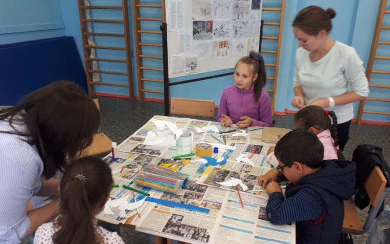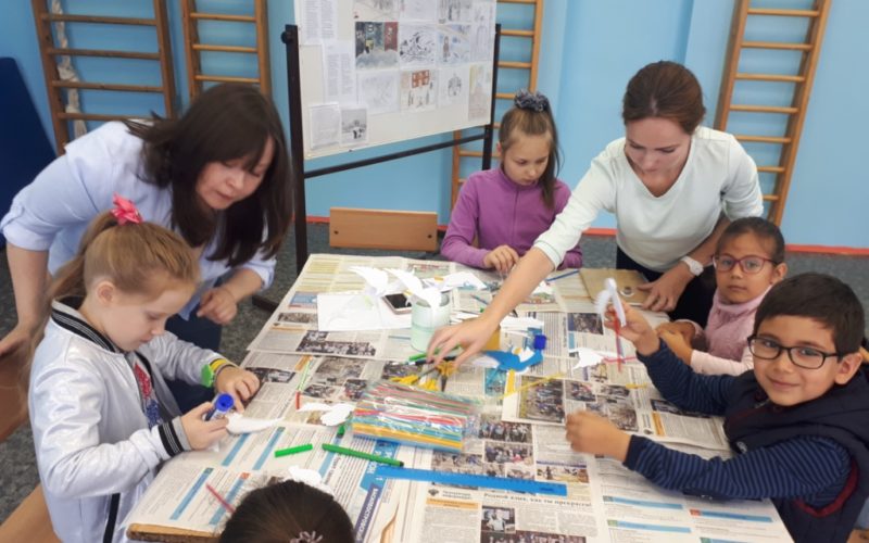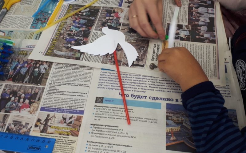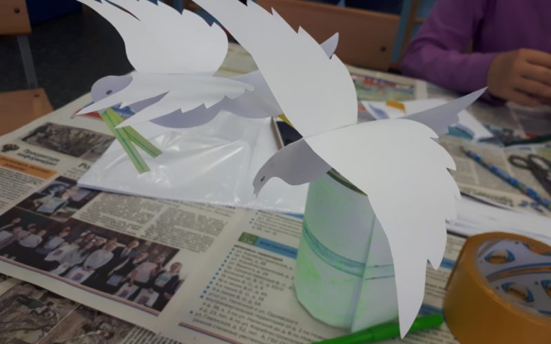 Ученики младшей школы и воспитанники отделения дошкольного образования поучаствовали в мастер-классах: делали открытки «В память о блокаде Ленинграда», изготавливали картины в нетрадиционной технике » Небо на городом». Самые маленькие гости школы попробовали выполнить аппликацию «Голубь мира».