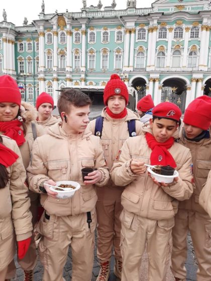 Каждый желающий смог попробовать настоящей армейской каши и горячего чая. В это же время на Дворцовой площади началось выступление Военного оркестра западного военного округа в составе 250 человек, а также петербургских творческих коллективов.