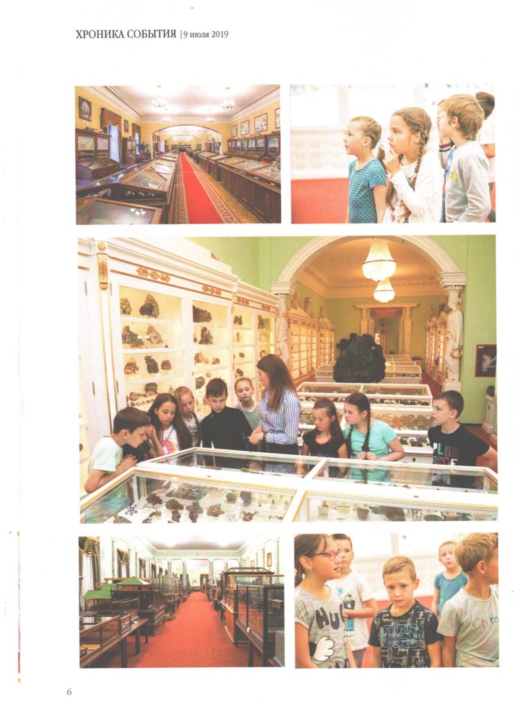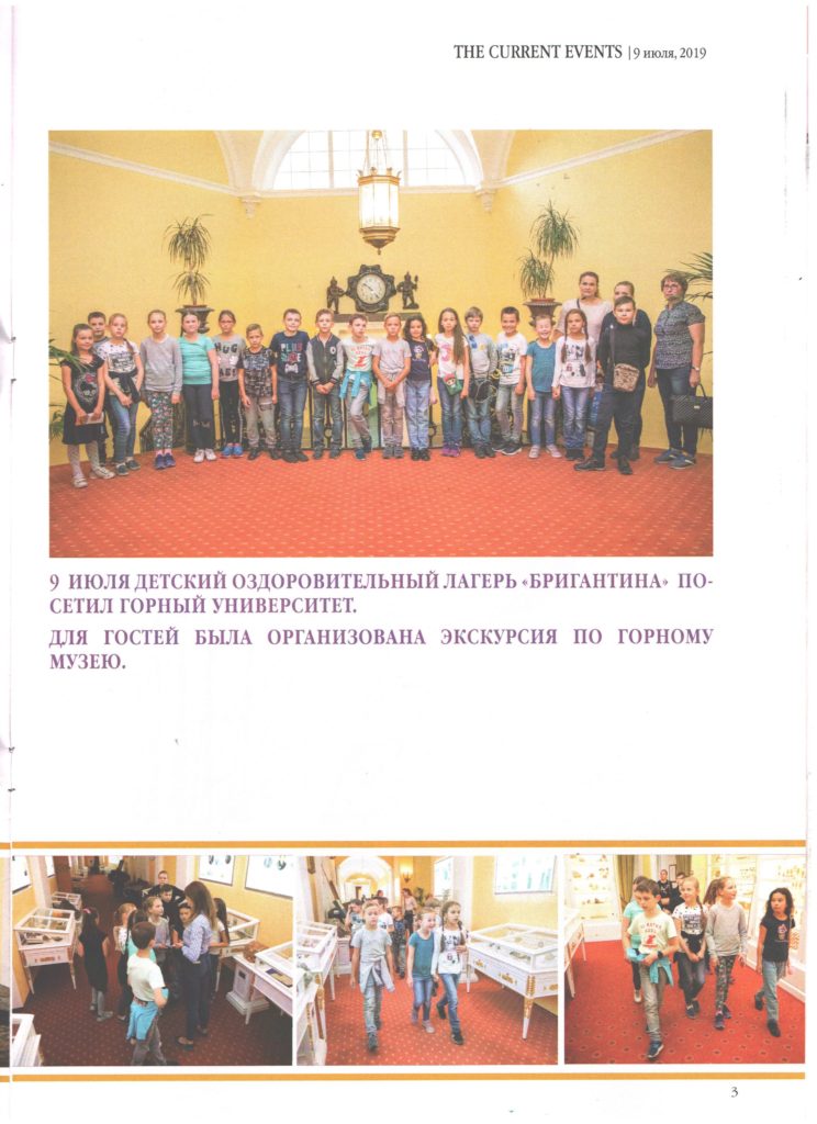 12 июля детский оздоровительный лагерь «Бригантина» Василеостровского района, посетил стены Горного университета. Для воспитанников лагеря, была организована экскурсия по горному музею, в котором находятся уникальные и ценные коллекции. Ребятам были представлены различные экспозиционные площадки, такие как, зал минералогии, колонный, полезные ископаемые и метеориты.