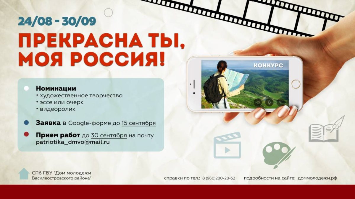 С 24 по 30 сентября для молодёжи от 14 до 30 лет проводится конкурс «Прекрасна ты, моя Россия!»