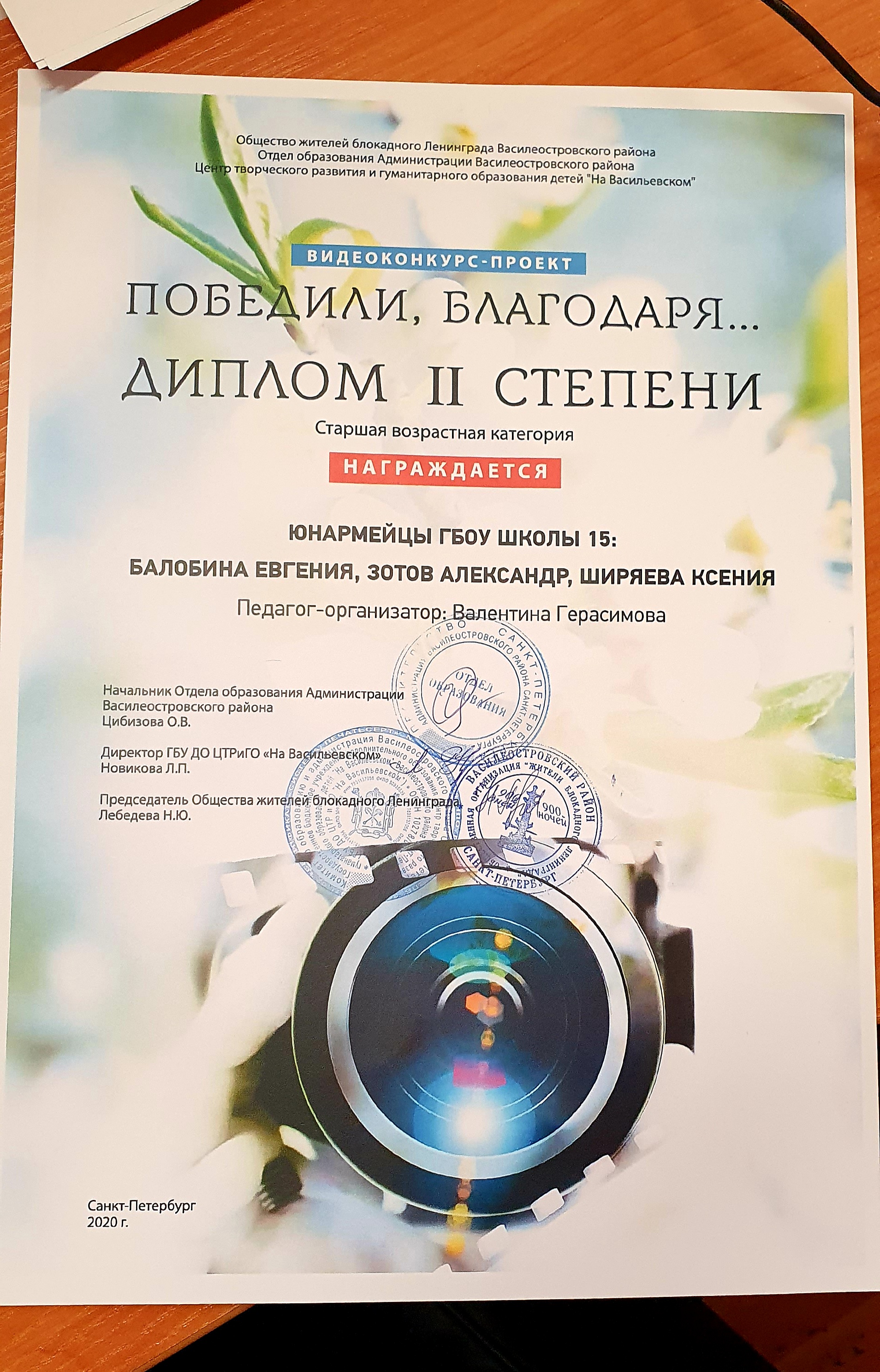 Поздравляем юнармейцев ГБОУ школа № 15 Василеостровского района Зотова Александра, Балобину Евгению и Ширяеву Ксению. Ребята — участники видеоконкурса «Победили,благодаря…» были награждены дипломом 2 степени.