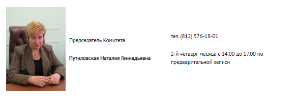 | Председатель Комитета | Путиловская Наталия Геннадьевна | 190000, пер. Антоненко, д. 8 Телефон: +7 (812) 576-18-01 | Время приёма: 2-й четверг месяца с 14.00 до 17.00 по предварительной записи |