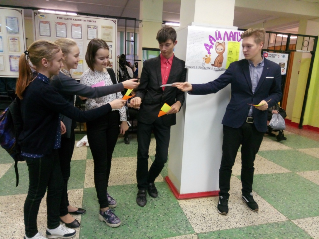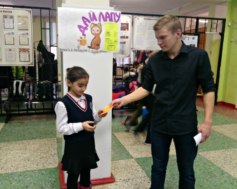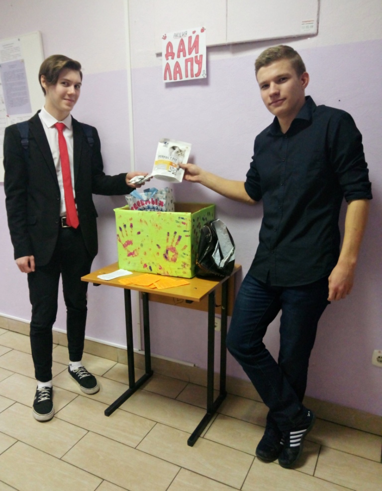 18 декабря 2017 волонтёрами школы № 15 Василеостровского района была организована акция «Дай лапу», направленная на сбор помощи животным, находящимся в приюте. В школе ими были развешены информационные плакаты, выданы листовки обучающимся и их родителям, призывающие проявить милосердие и по мере возможности оказать необходимую приюту помощь. Ребятами был установлен и оформлен пункт приёма подарков для животных, к которому в течение недели приходили все, неравнодушные к нуждающимся в поддержке животным. Откликнулись на призыв о помощи и принимали активное участие в акции как сами школьники, так и педагоги. Собрав целую посылку, ребята оформили её, как новогодний подарок животным и передали в приют. Они искренне верят, что, возможно, помогли спасти чью-то жизнь или хотя бы просто порадовали животных, проживающих в приюте и его работников. Наши волонтёры не думают останавливаться на этом, а планируют прикладывать все свои усилия и продолжать помогать не только этим и другим животным, но и всем тем, кому они могут быть полезными, тем,кто постоянно нуждается в такой поддержке.