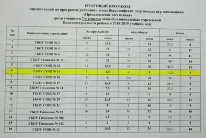 Команда 7 Б класса ГБОУ школа №15 заняла 3 МЕСТО в спортивном многоборье по программе «ПРЕЗИДЕНТСКИЕ СОСТЯЗАНИЯ» среди учащихся 7 классов школ Василеостровского района. Поздравляем!