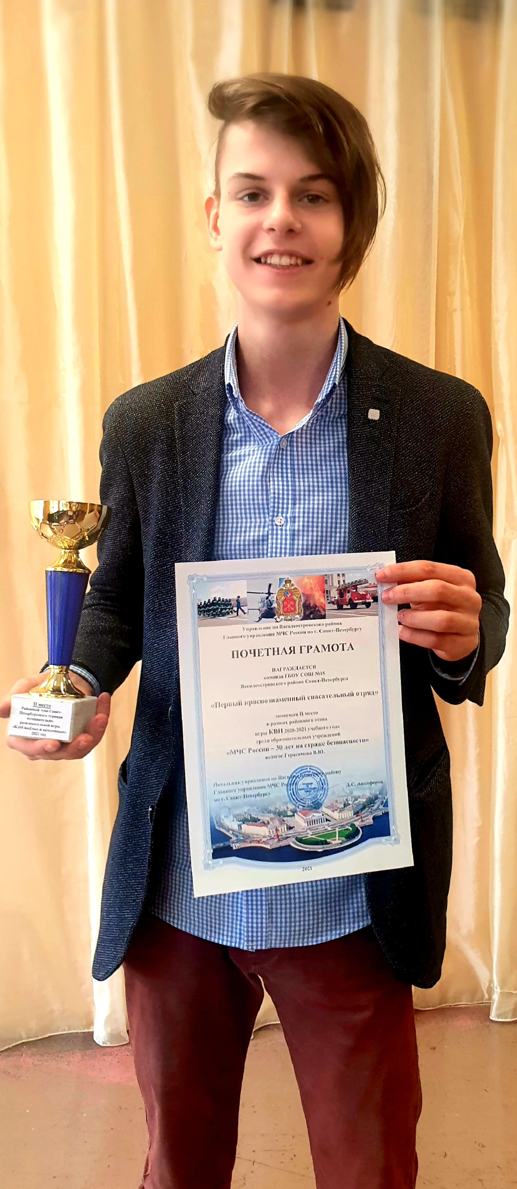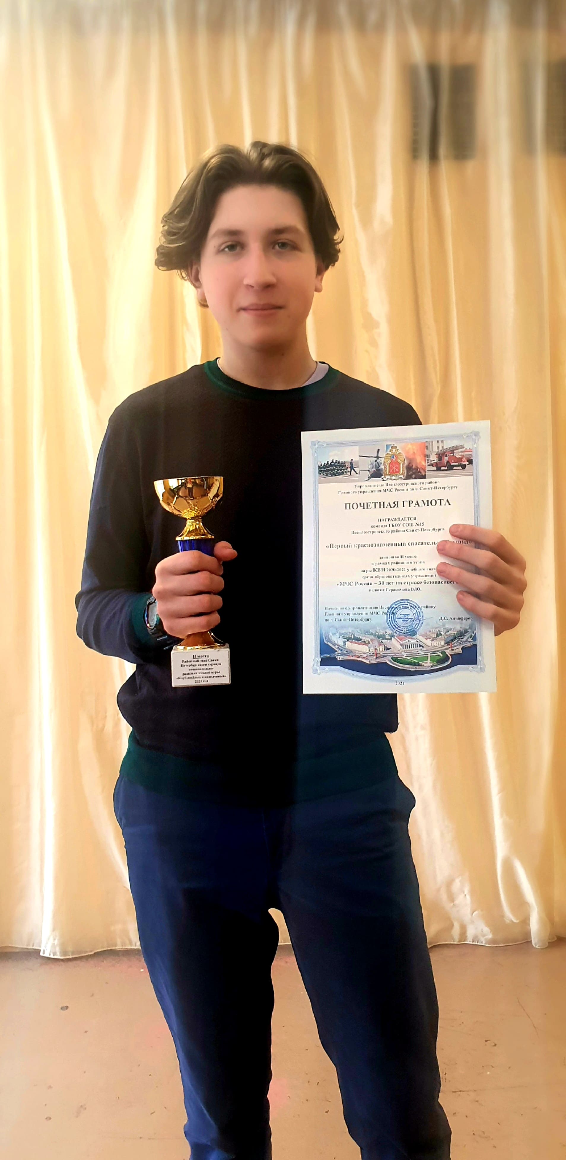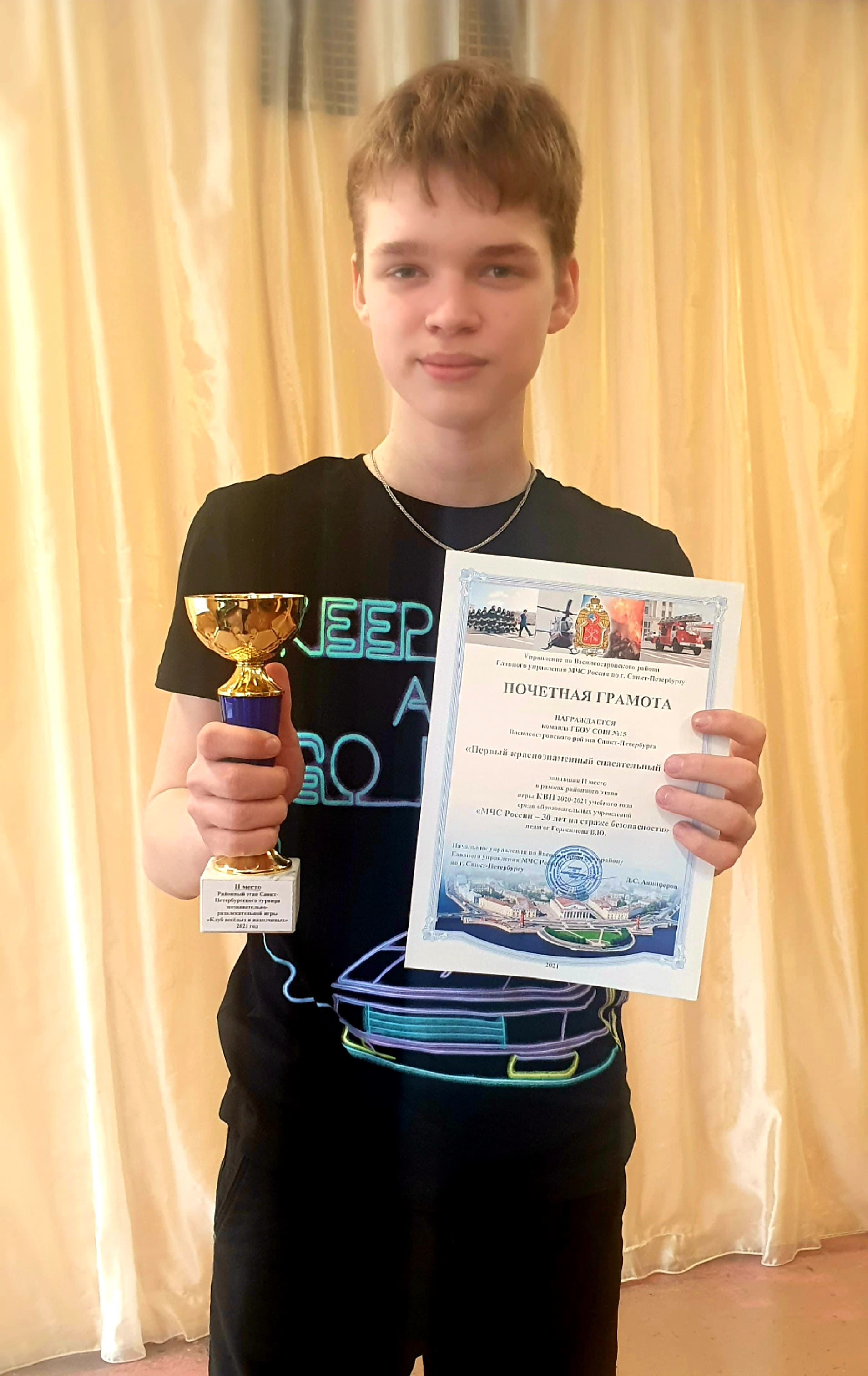 Обучающиеся 8 класса школы N15, призёры районного тура познавательно-развлекательной игры «Клуб веселых и находчивых» среди образовательных учреждений Санкт-Петербурга по противопожарной тематике, награждены кубком и дипломами за 2 место! Поздравляем!