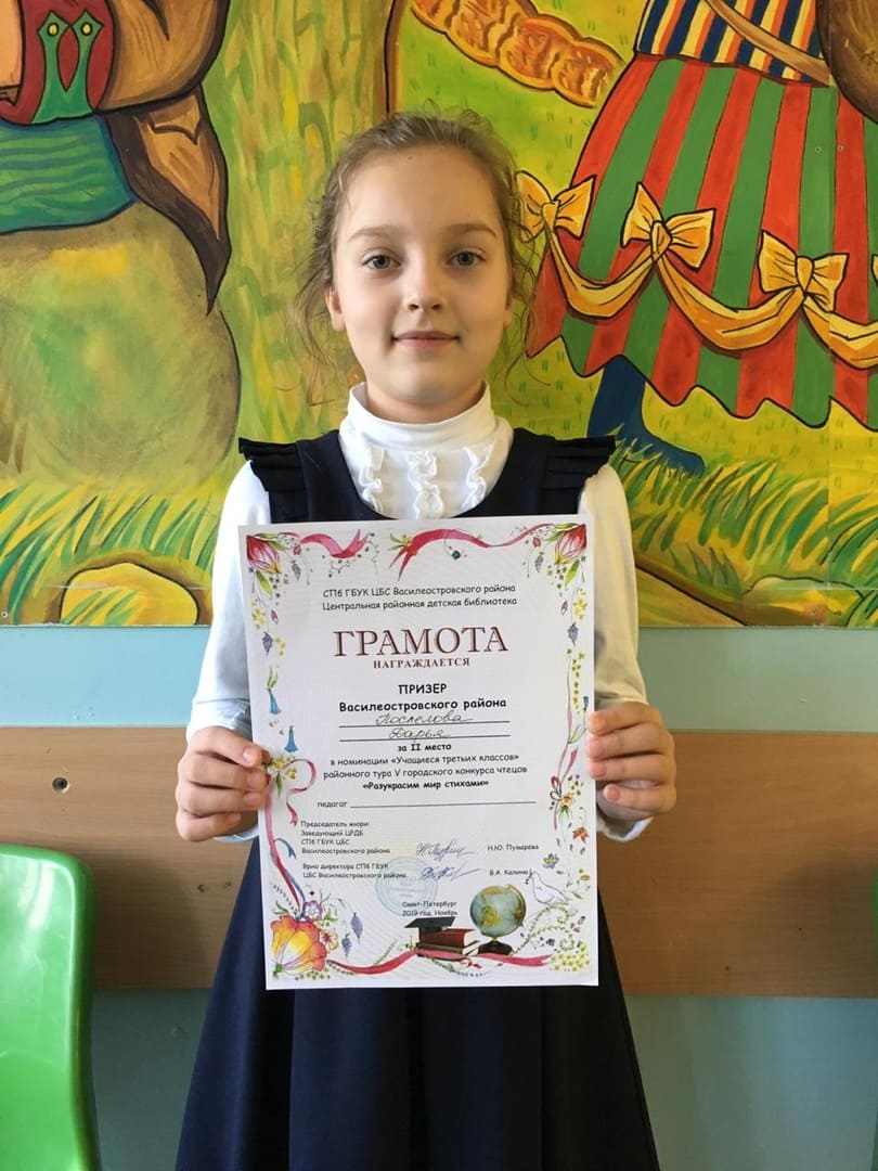 Ученица 3 Б класса ГБОУ школа № 15 Поспелова Дарья стала призёром (2 место) районного тура V городского конкурса чтецов «Разукрасим мир стихами». Конкурс традиционно прошел в Центральной районной детской библиотеке Василеостровского района.