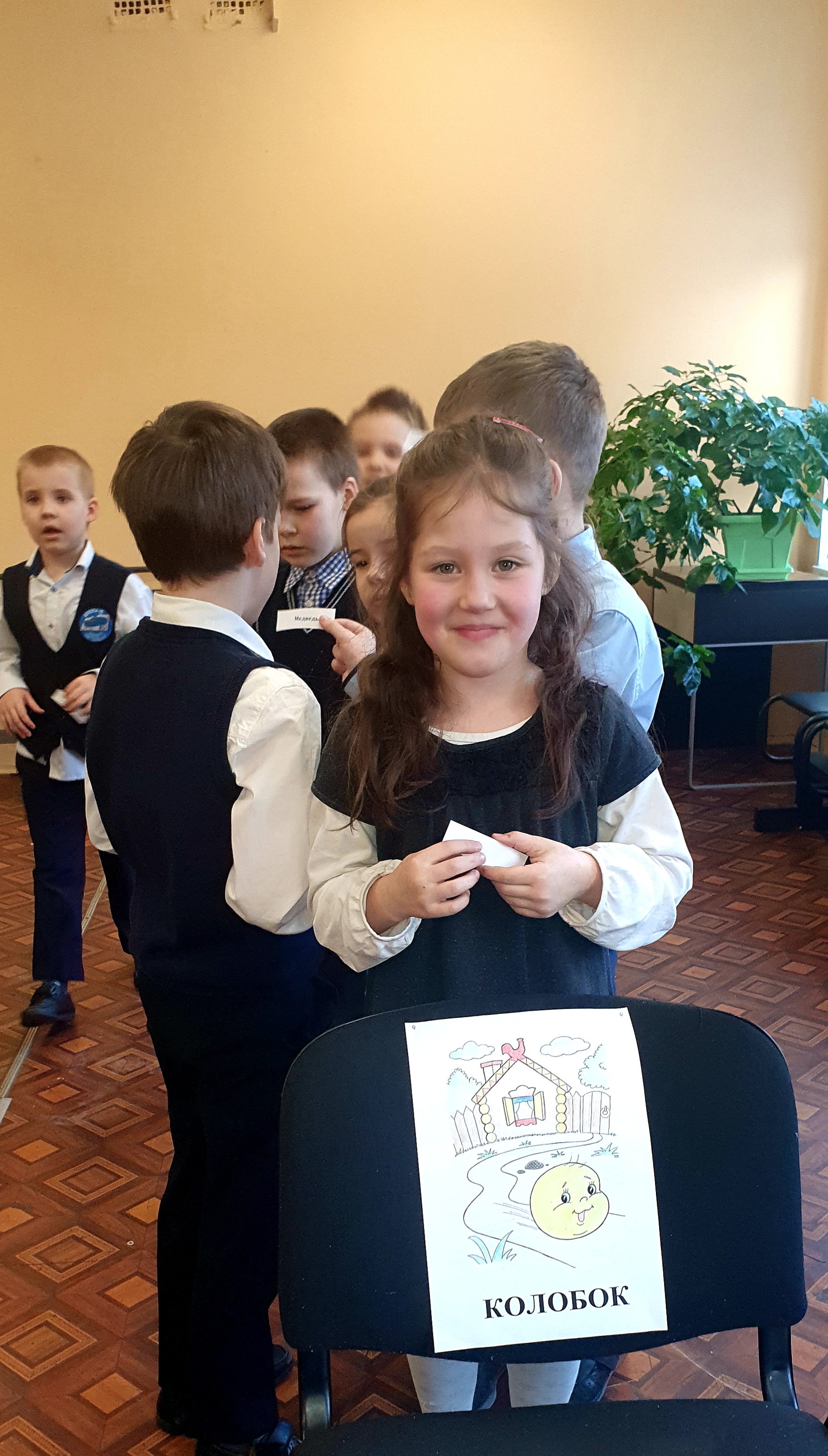 Затем карточки с именами героев были розданы детям. Надо было определить сказку, героем которой был каждый участник игры, и объединиться в группы. После чего найти табличку с названием сказки и построиться в том порядке, как появляются герои в этой сказке.