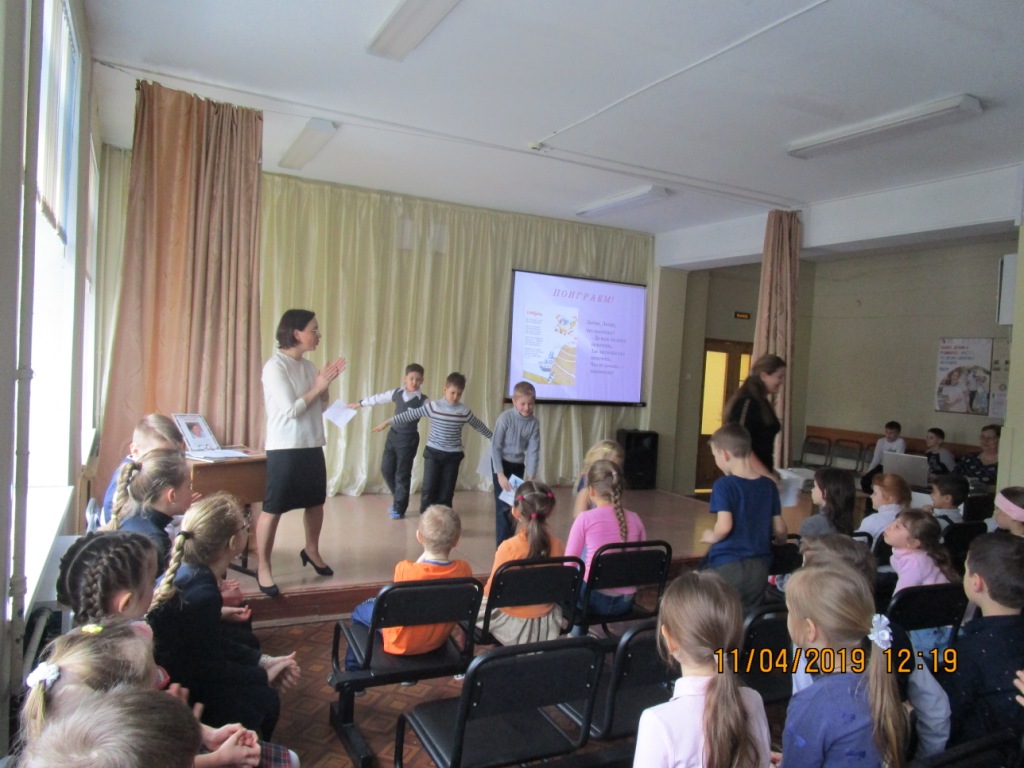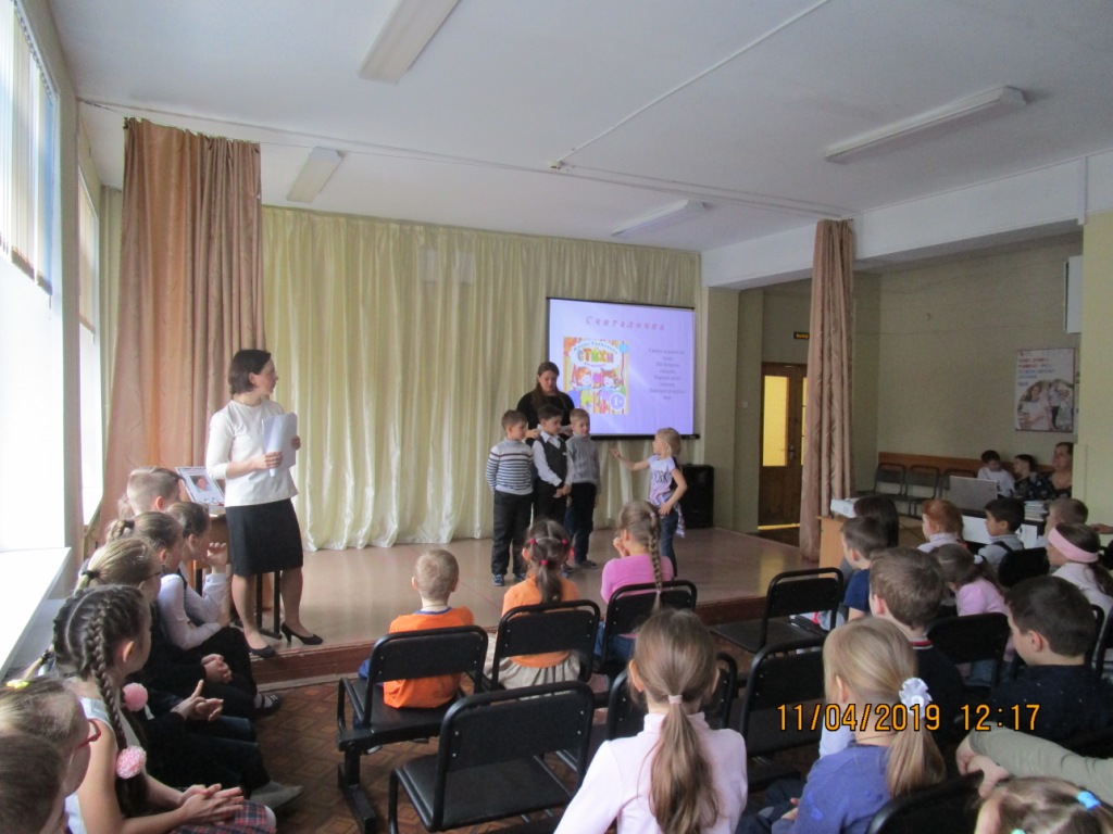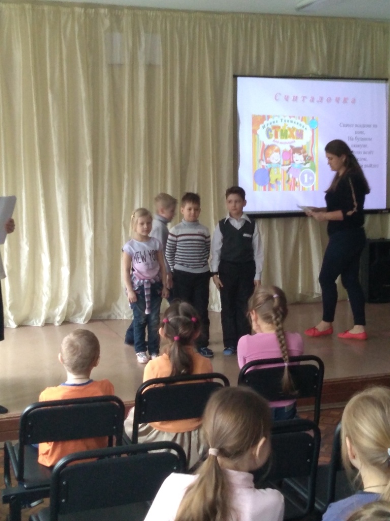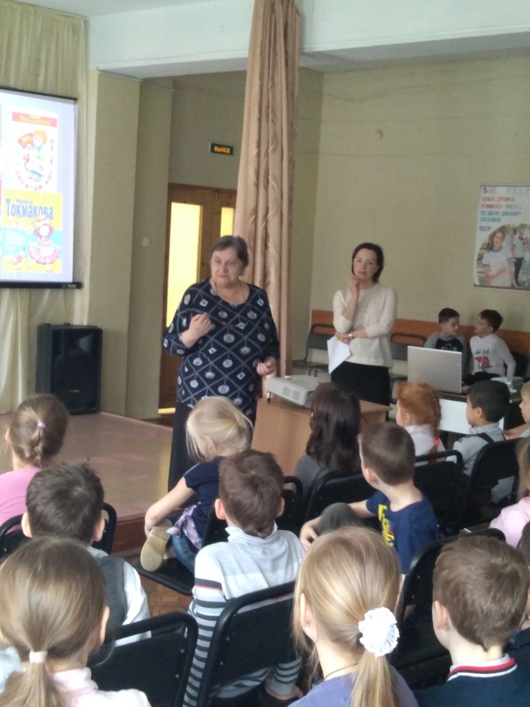Учащиеся 3Б класса (Антонов А., Дыба С., Евдокименко Т., Клименко Е., Панина А., Чурилова А.) вместе с учителем Ильиной Татьяной Александровной читали стихи Ирины Токмаковой, играли с залом в весёлые игры по её стихам.