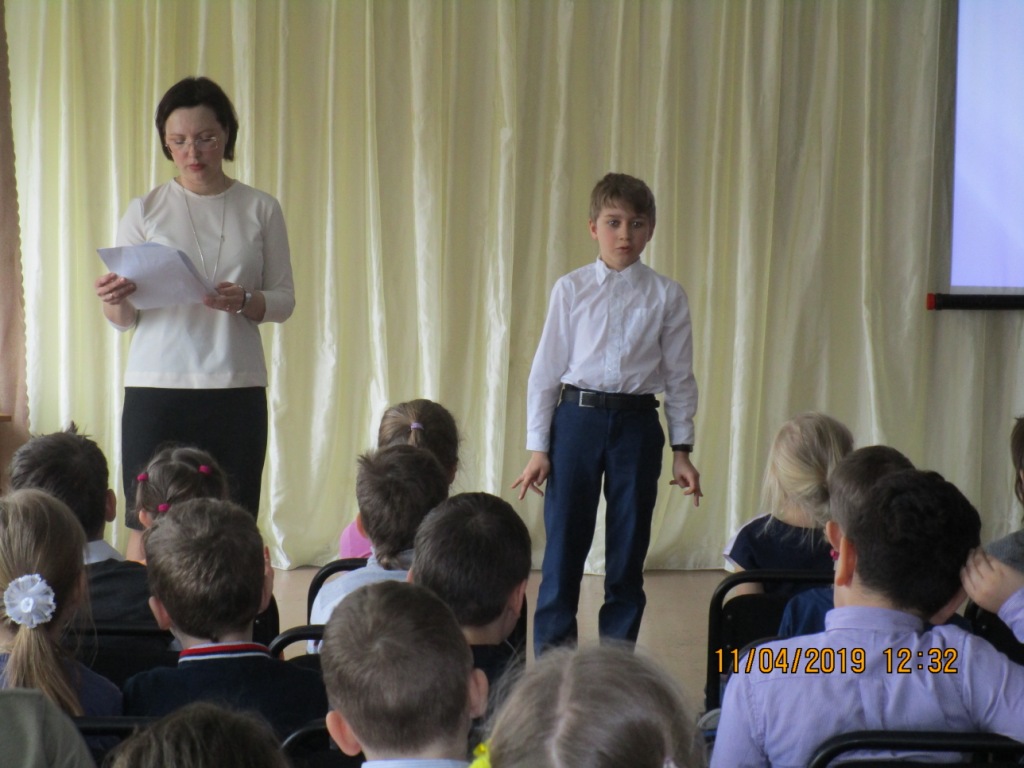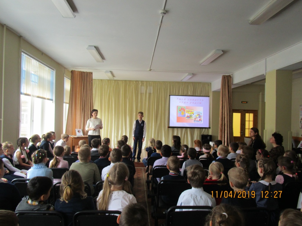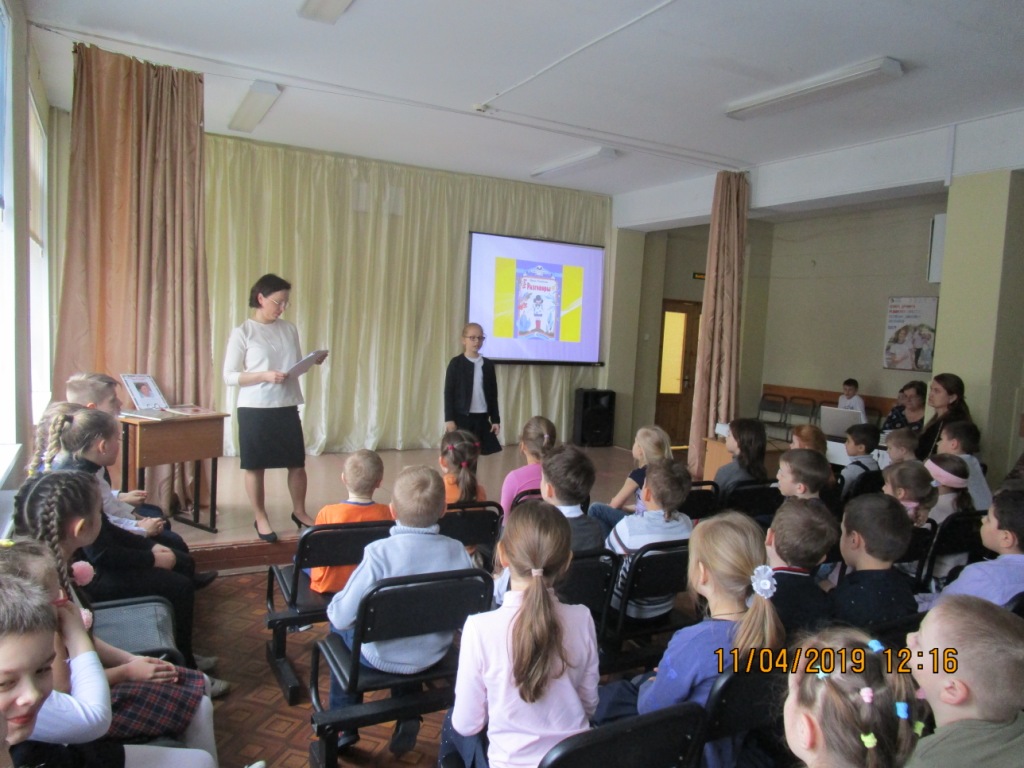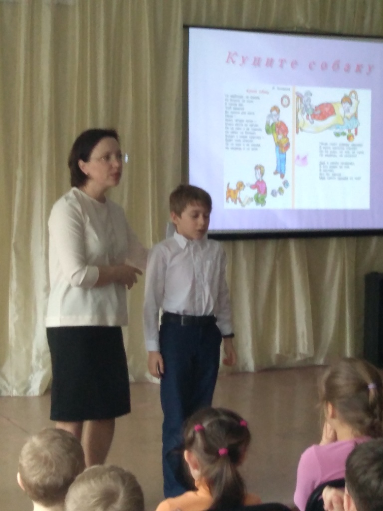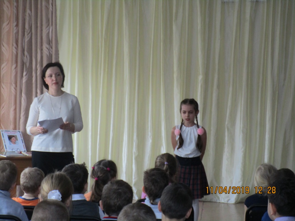 Учащиеся 3Б класса (Антонов А., Дыба С., Евдокименко Т., Клименко Е., Панина А., Чурилова А.) вместе с учителем Ильиной Татьяной Александровной читали стихи Ирины Токмаковой, играли с залом в весёлые игры по её стихам.